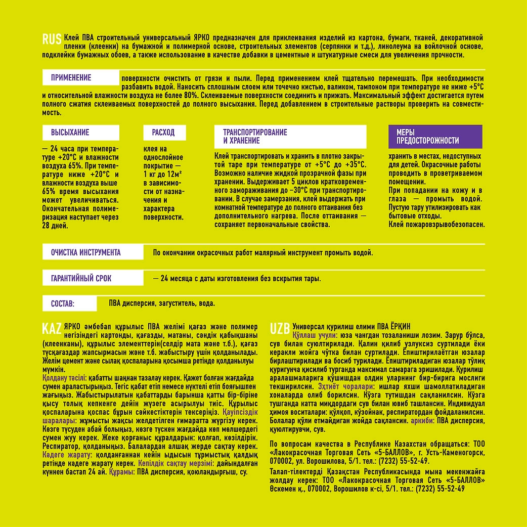 Клей ПВА строительный универсальный ЯРКО предназначен для приклеивания изделий из картона, бумаги, тканей, декоративной пленки (клеенки) на бумажной и полимерной основе, строительных