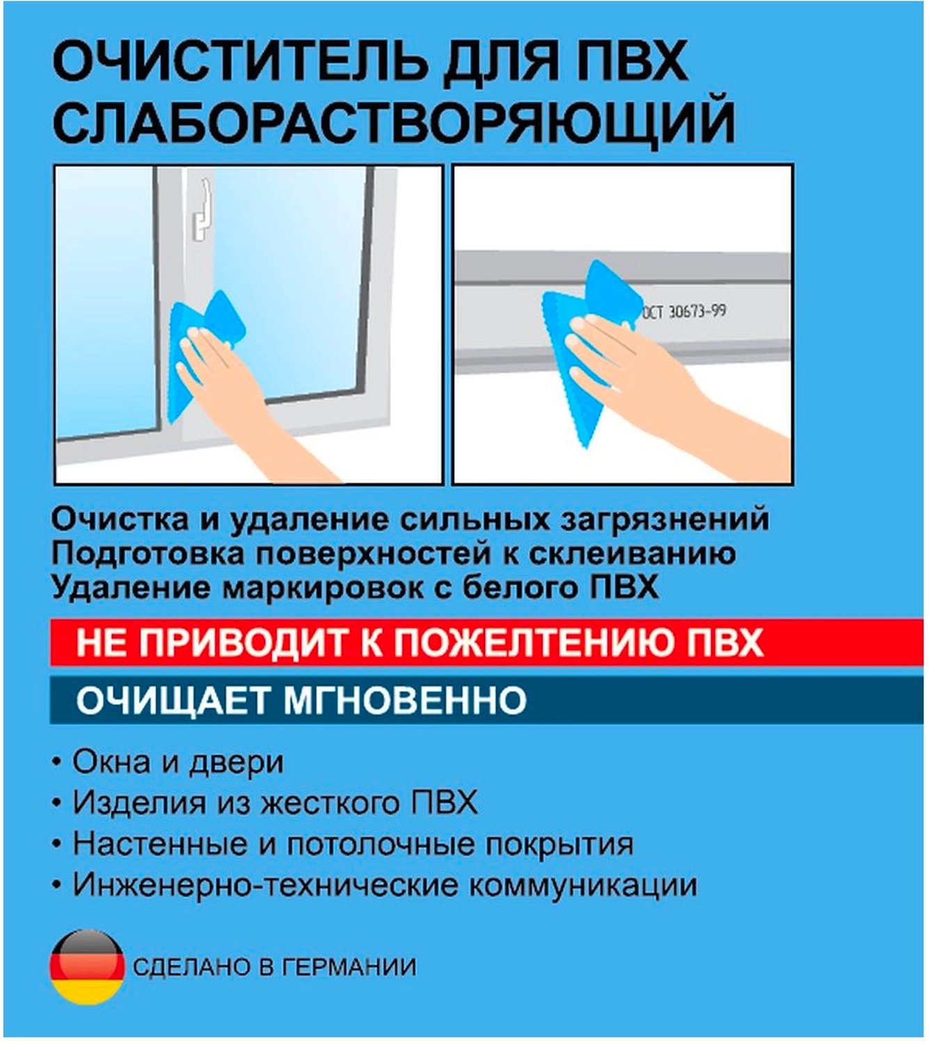Слабо растворяющее чистящее средство для специальной подготовки поверхностей к склеиванию, удаления маркировки и грубых загрязнений.