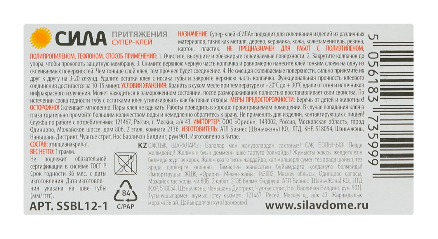 Супер клей Сила SSBL 12-1, 1 гр