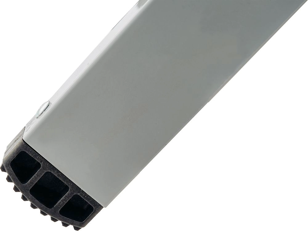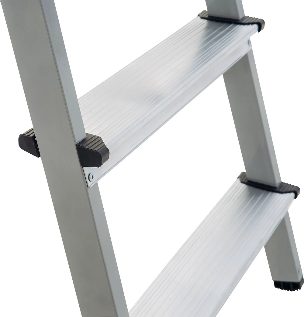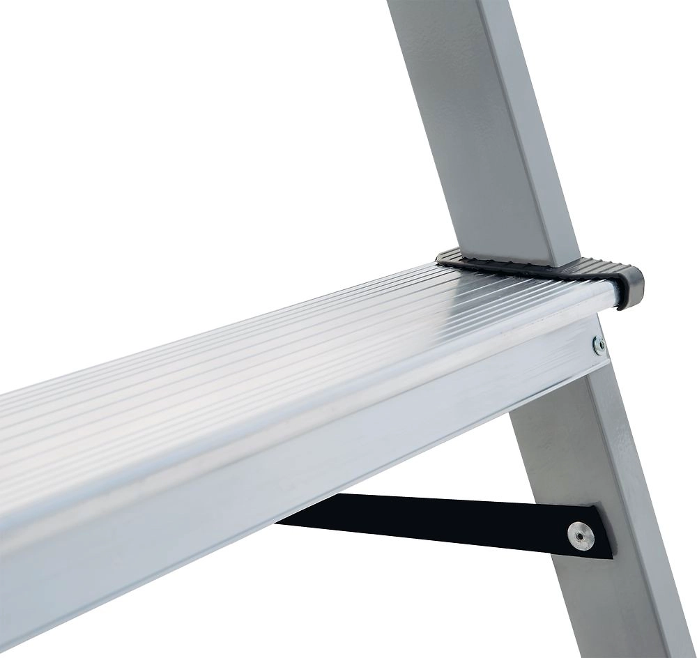 Обеспечивает доступ к рабочему месту с двух сторон без перестановки. Стремянка оснащена безопасной складной площадкой 350х160 мм, которую удобно использовать для размещения инвентаря или как верхнюю ступень. Высота площадки 0,43 м, рабочая высота 2,43 м (при среднем росте 1,7 м), вес 2,3 кг. Рифлёные ступени 80 мм с закруглёнными краями берегут голени от травм. Крепление ступеней к стойкам на 4 разжимных заклепках придаёт стремянке высокую статическую и динамическую прочность. Страховочные ремни на заклёпках с увеличенной шляпкой создают жёсткую конструкцию, не гниют и не выгорают. Прочные опорные наконечники из пластика не скользят и не повреждают поверхность.
