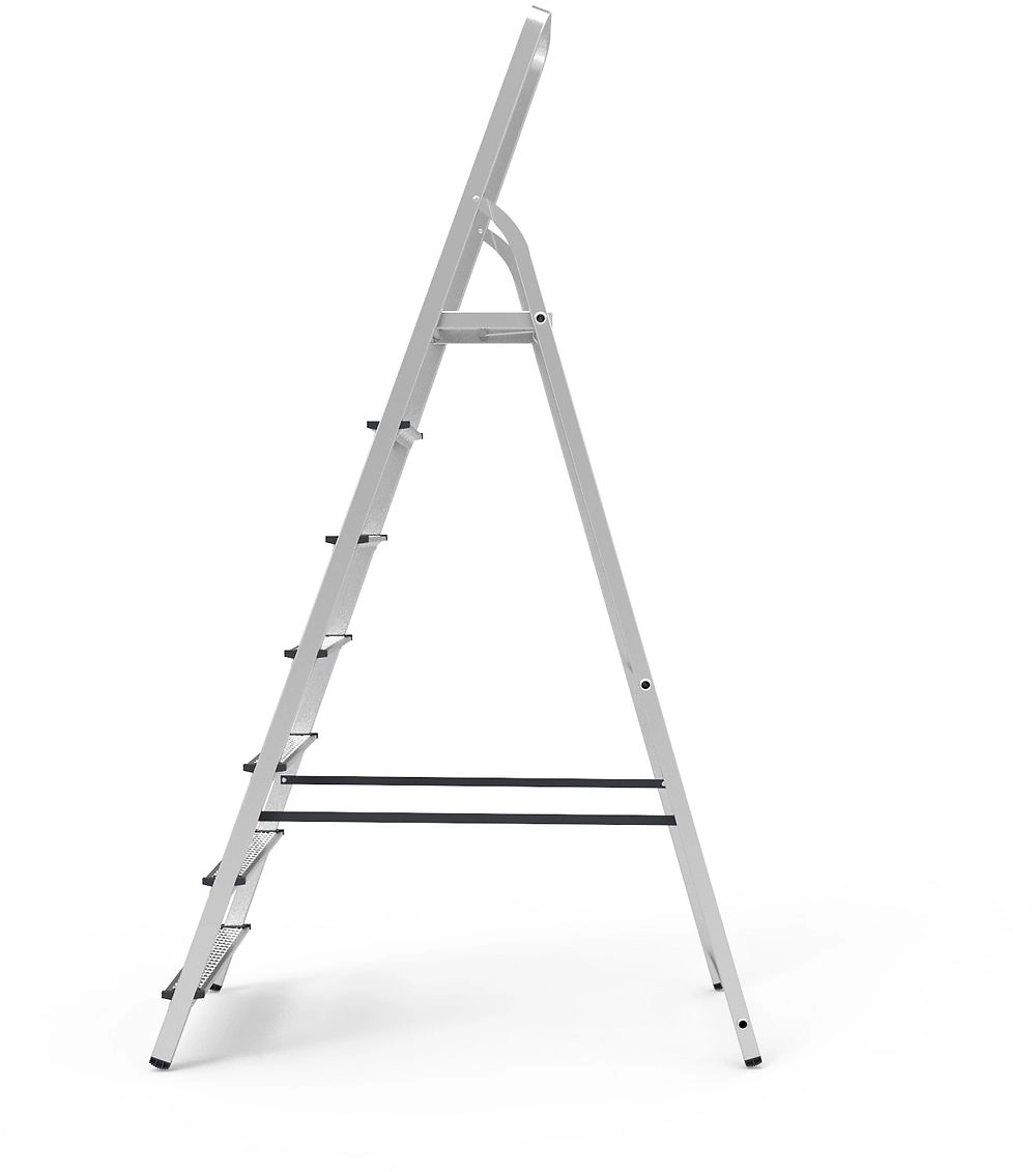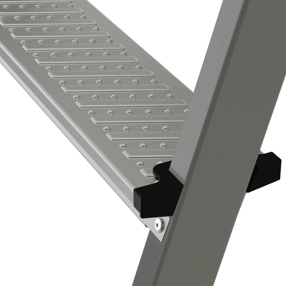 Стремянка оснащена безопасной рифлёной рабочей площадкой 255х255 мм из оцинкованной стали с загнутыми краями. Высота площадки 1,47 м, рабочая высота 3,47 м (при среднем росте 1,7 м), вес 9,3 кг. Высокая дуга безопасности 600 мм обеспечивает точку опоры на высоте. Рифлёные оцинкованные стальные ступени 70 мм с дополнительным ребром жёсткости и закруглёнными краями берегут голени от травм. Крепление ступеней к стойкам на 4 разжимных заклепках придаёт стремянке высокую статическую и динамическую прочность. Тройное крепление стоек заднего каркаса с развальцовкой повышает устойчивость стремянки. Страховочные ремни на заклёпках с увеличенной шляпкой создают жёсткую конструкцию, не гниют и не выгорают. Прочные опорные наконечники из пластика не скользят и не повреждают поверхность.