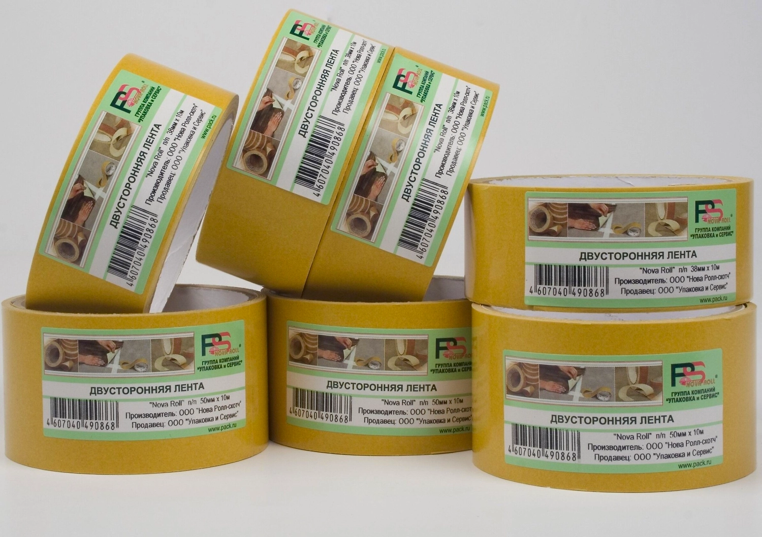Лента с основой из полипропилена с нанесением с обеих сторон клеевого слоя. Внешняя клеевая сторона двухстороннего скотча защищена полосой из вощеной бумаги.