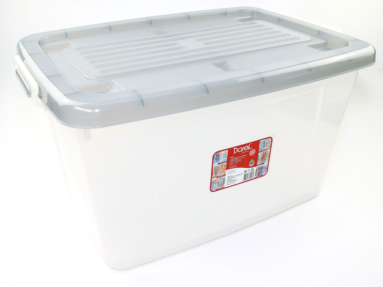 Большой пластиковый контейнер (вместительностью 75 л) прекрасно подходит для хранения различных вещей и мелочей. Имеет небольшие габариты, с легкостью помещается в шкафах и тумбах. Крышка обеспечивает герметичность закрытия, что важно для хранения вещей.