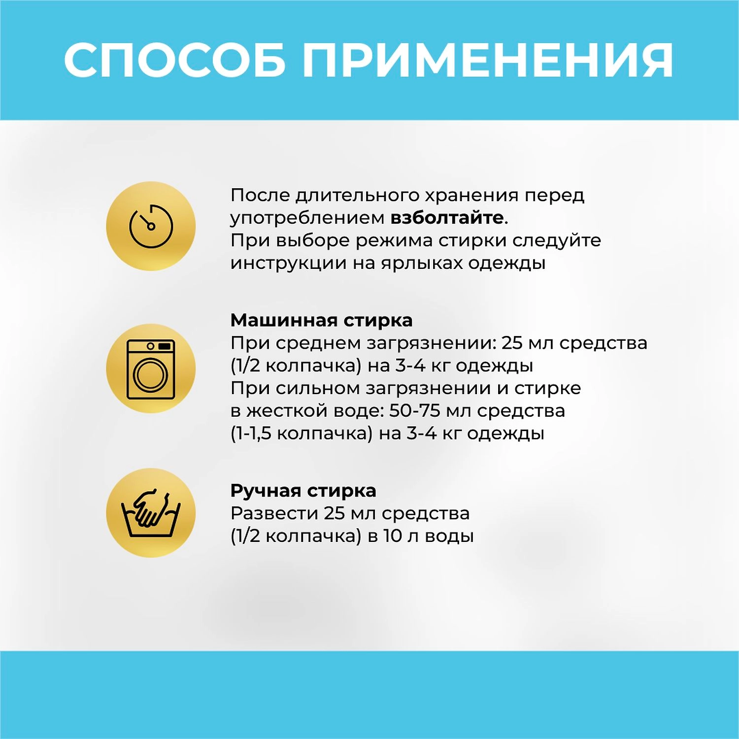 При среднем загрязнении: 25 мл средства (1/2 колпачка) на 3-4 кг одежды. При сильном загрязнении и стирке в жесткой воде: 50-75 мл средства (1-1,5 колпачка) на 3-4 кг одежды.