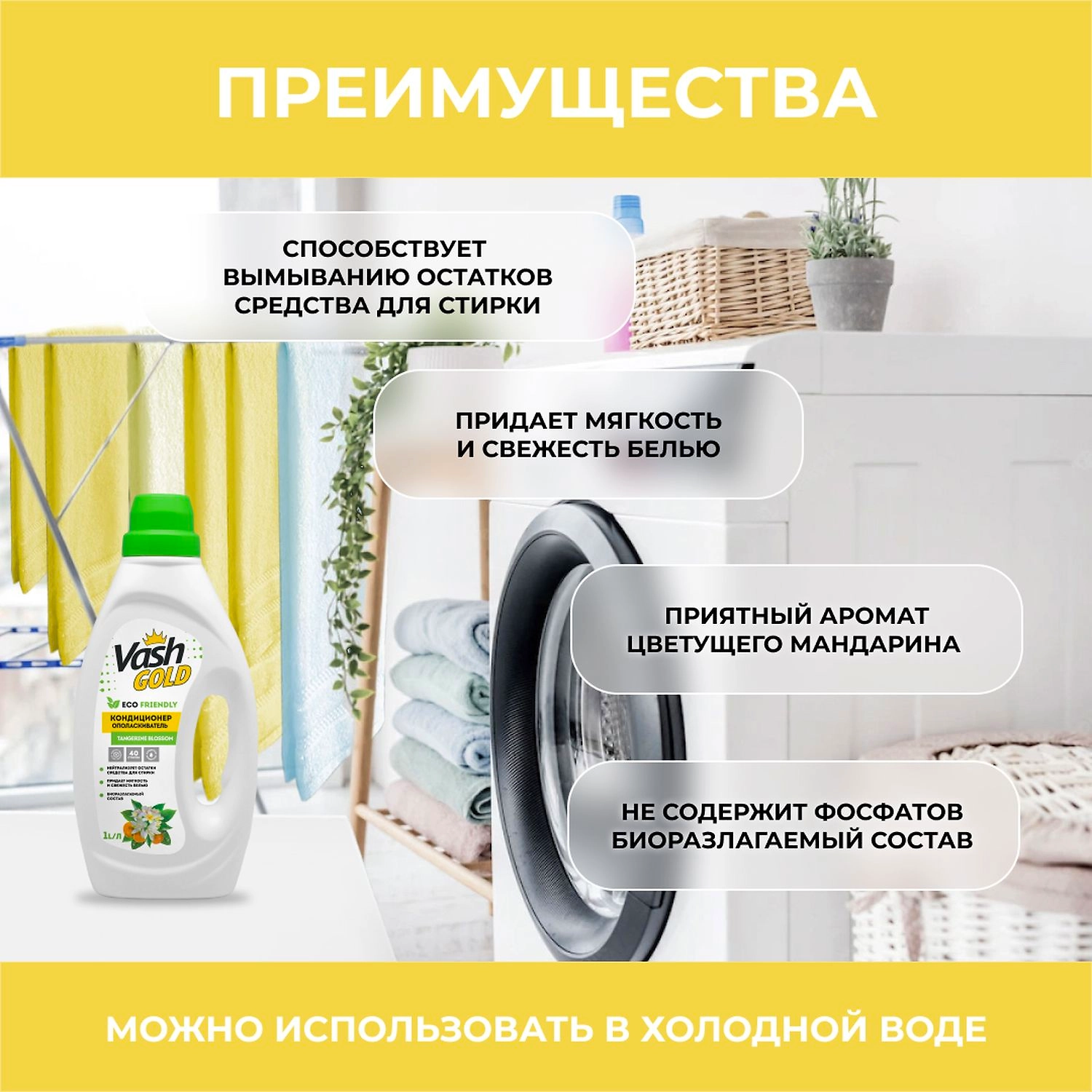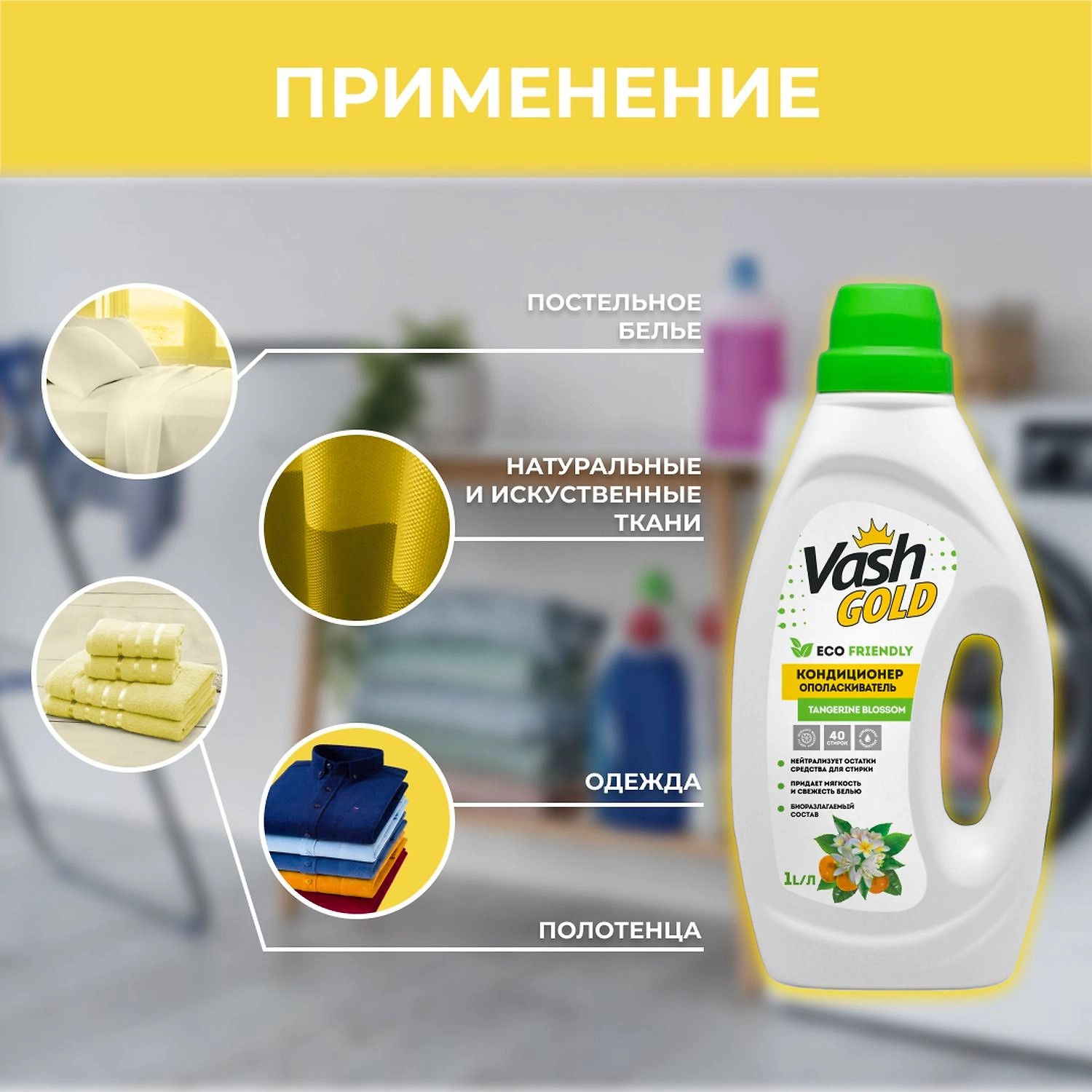 Концентрированный кондиционер-ополаскиватель превосходно ухаживает за всеми видами белья, нейтрализует остатки стирального средства, снимал статическое электричество, смягчает волокна, облегчает