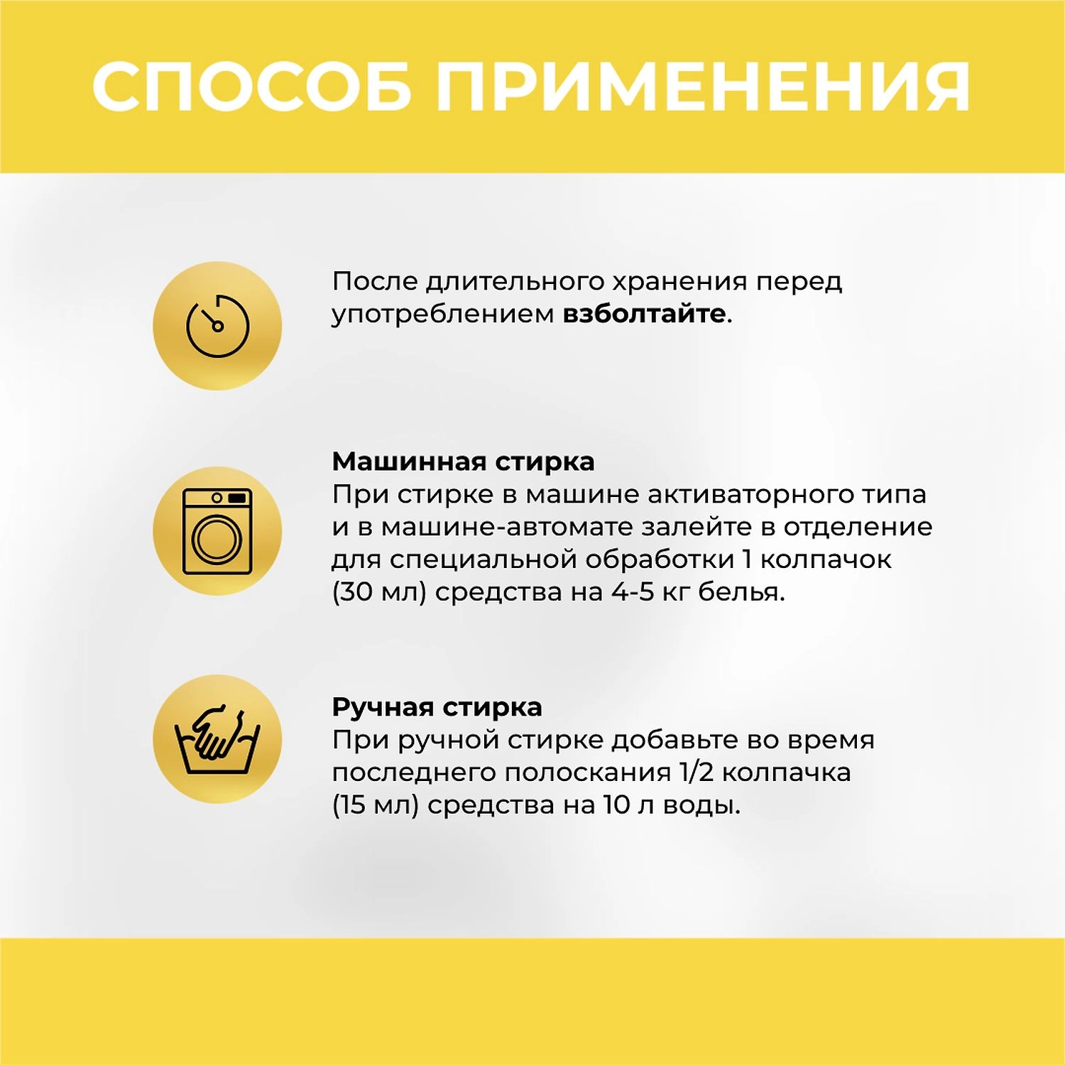 Ручная стирка: 15 мл на 10л воды. Автоматическая стирка: 30 мл на 4-5 кг белья.