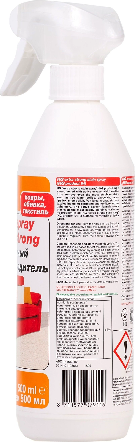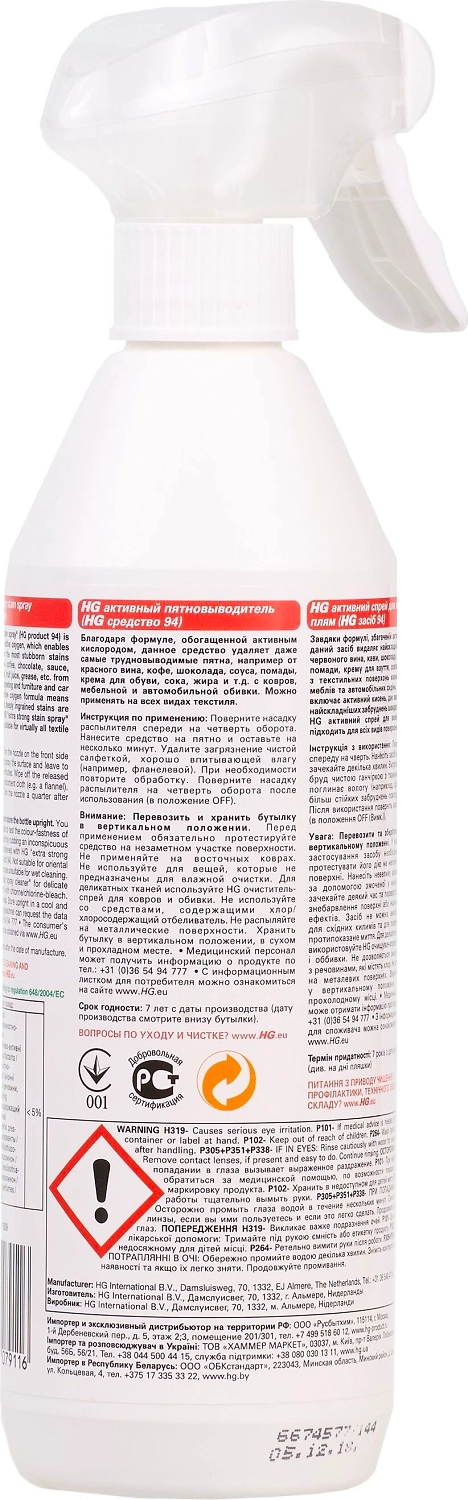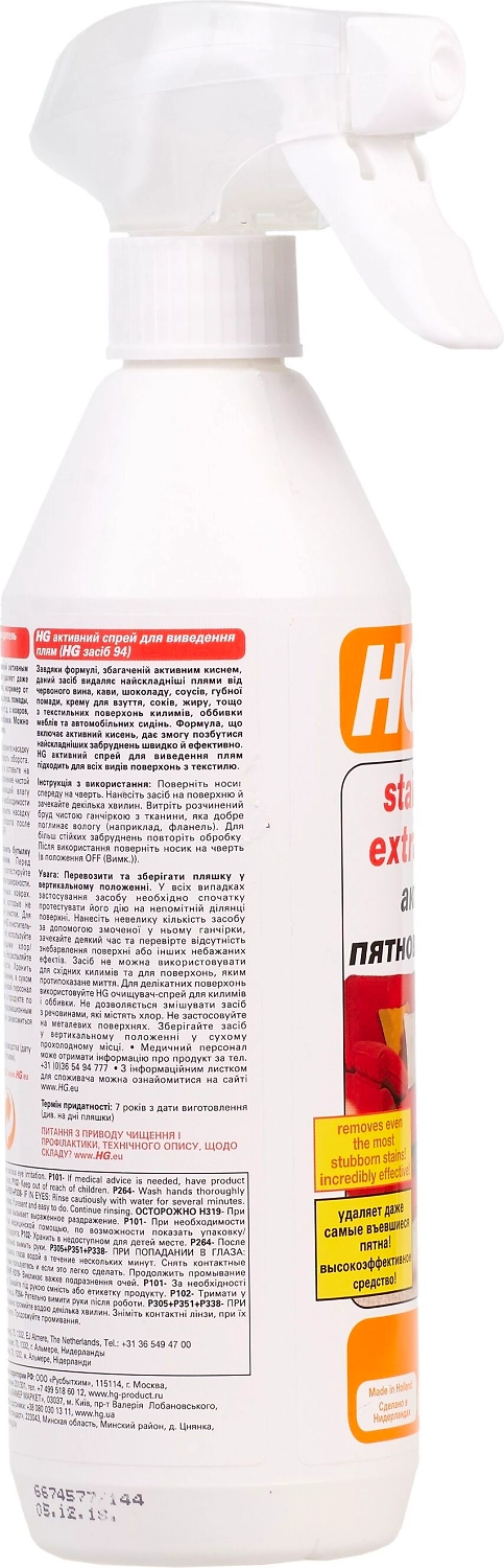 HG aктивный пятновыводитель (HG средство 94) Благодаря формуле, обогащенной активным кислородом, данное средство удаляет даже самые въевшиеся и трудновыводимые пятна (красное вино, кофе, шоколад, соус, помада, крем для обуви, сок, жир и т.д.) Удаляет пятна с ковров, мебельной и автомобильной обивки. Можно применять на всех видах текстиля.