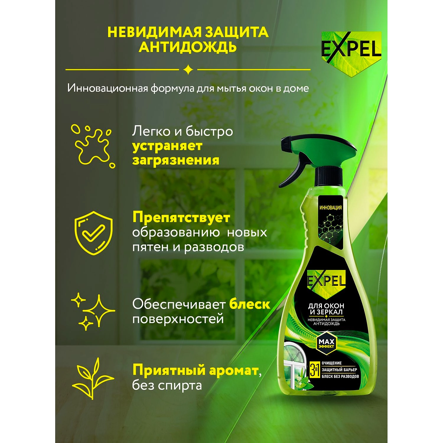 Инновационное средство для мытья окон и зеркал. Эффективно отмывает поверхность и создает защитный барьер. Особый компонент в составе препятствует появлению пятен и разводов.