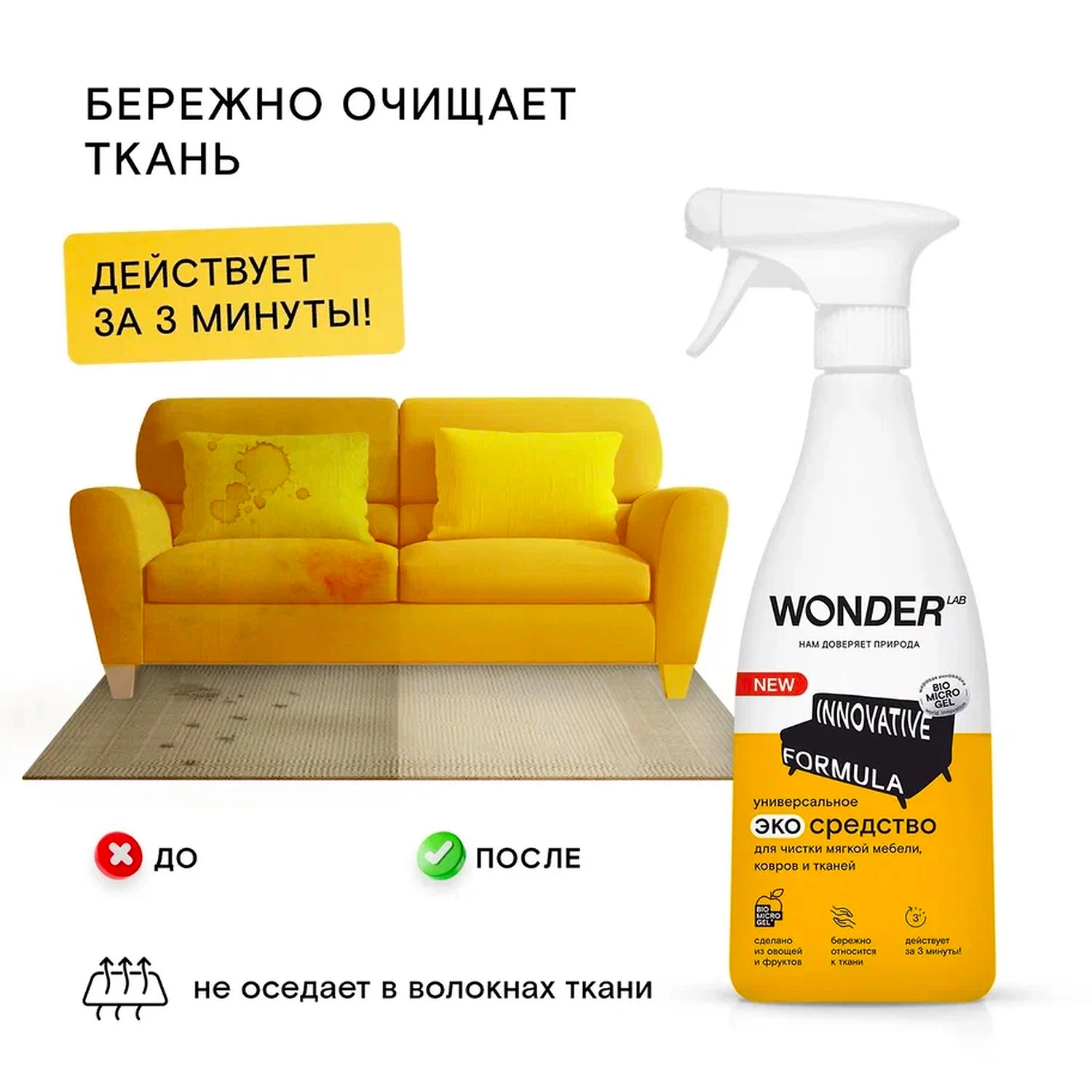 Экосредство для чистки мебели, ковров и текстиля специально разработано для бережной очистки волокон ткани. Можно использовать для удаления пятен с одежды.