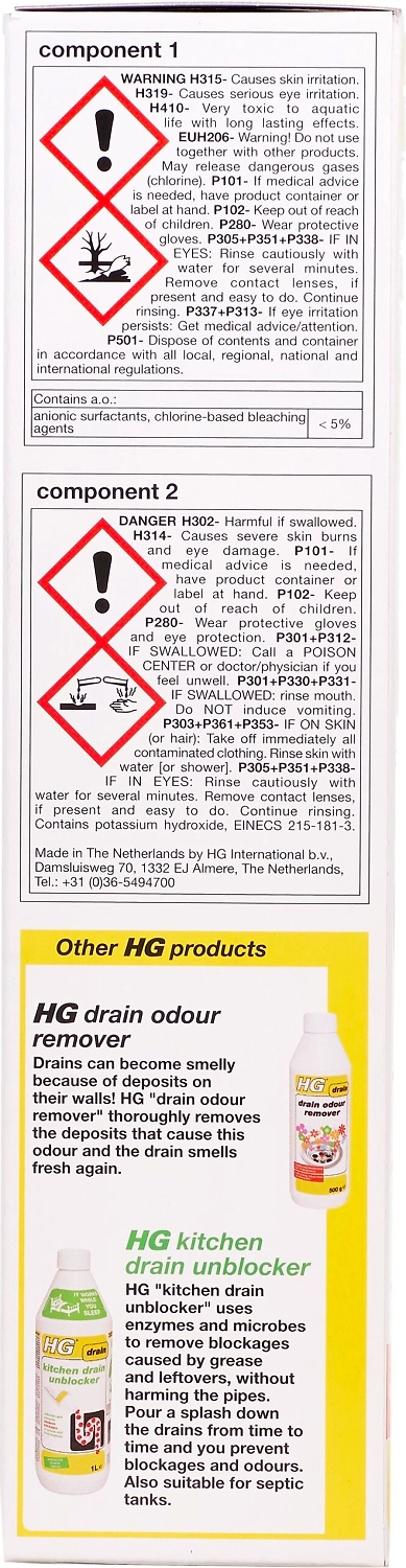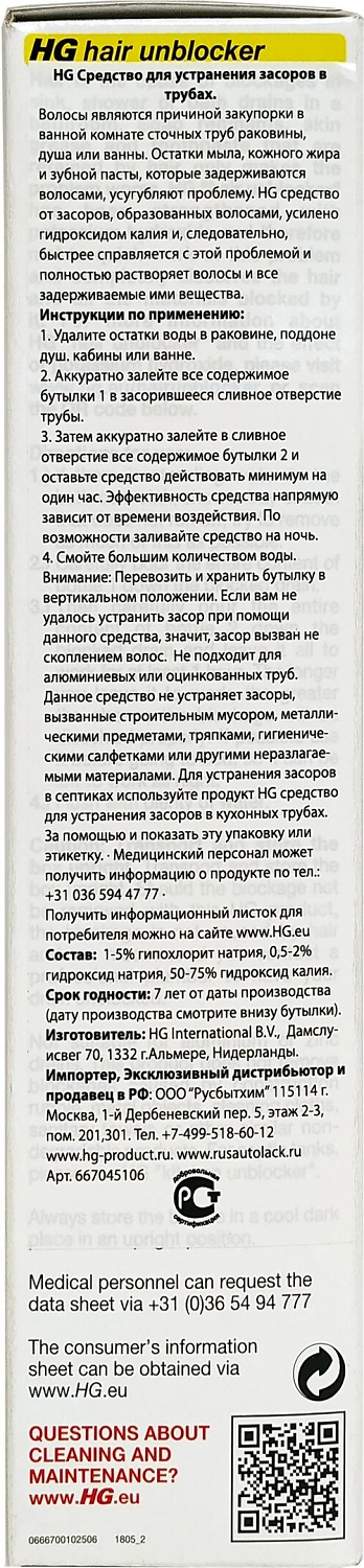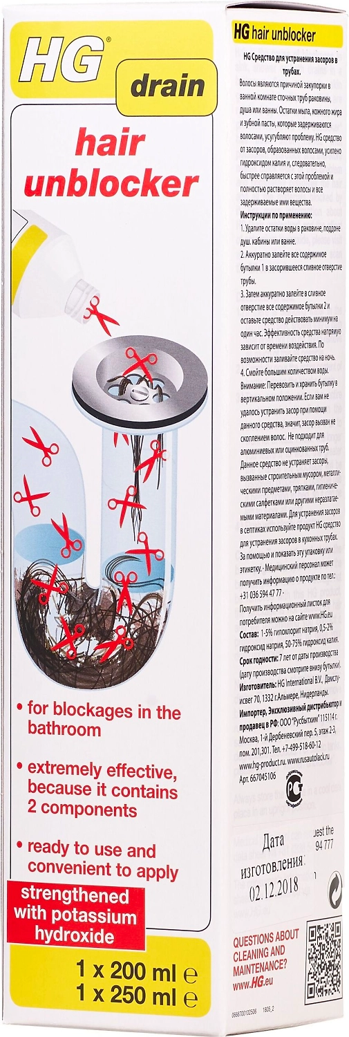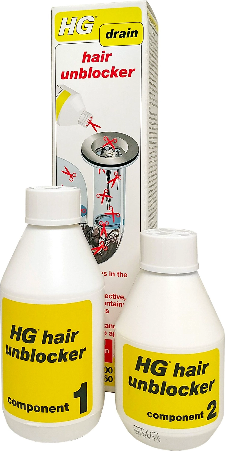 Волосы являются причиной закупорки в ванной комнате сточных труб раковины, душа или ванны. Остатки мыла, кожного жира и зубной пасты, которые задерживаются волосами, усугубляют проблему. HG "Средство для устранения засоров в трубах" усилено гидроксидом калия и, следовательно, быстрее справляется с этой проблемой и полностью растворяет волосы и все задерживаемые ими вещества.