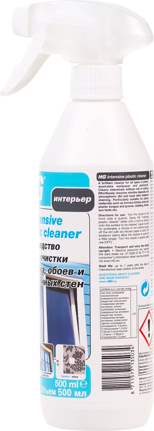 HG Средство для очистки пластика, обоев и окрашенных стен предназначено для удаления следов асмосферных осадков, никотинового налета и другой въевшейся грязи. Идеально подходит для очистки поверхностей из пластика (подоконник, оконные рамы, МДФ, ламинированный пластик), моющихся обоев, плакирования, жалюзи. Не вызывает обесцвечивание поверхности.