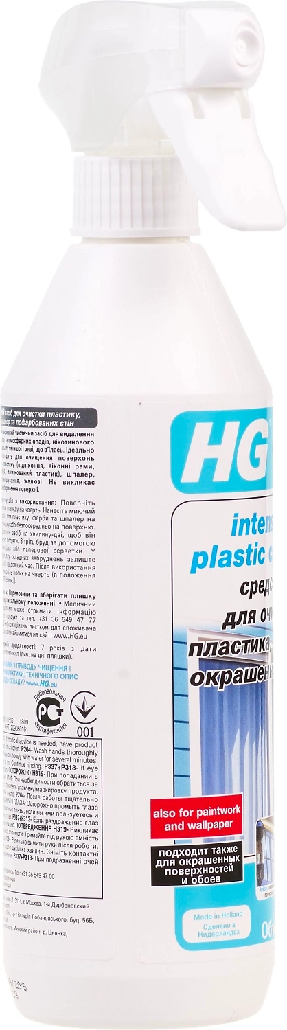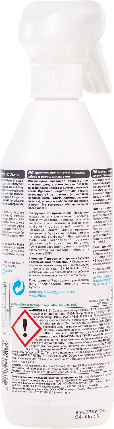 HG Средство для очистки пластика, обоев и окрашенных стен предназначено для удаления следов асмосферных осадков, никотинового налета и другой въевшейся грязи.