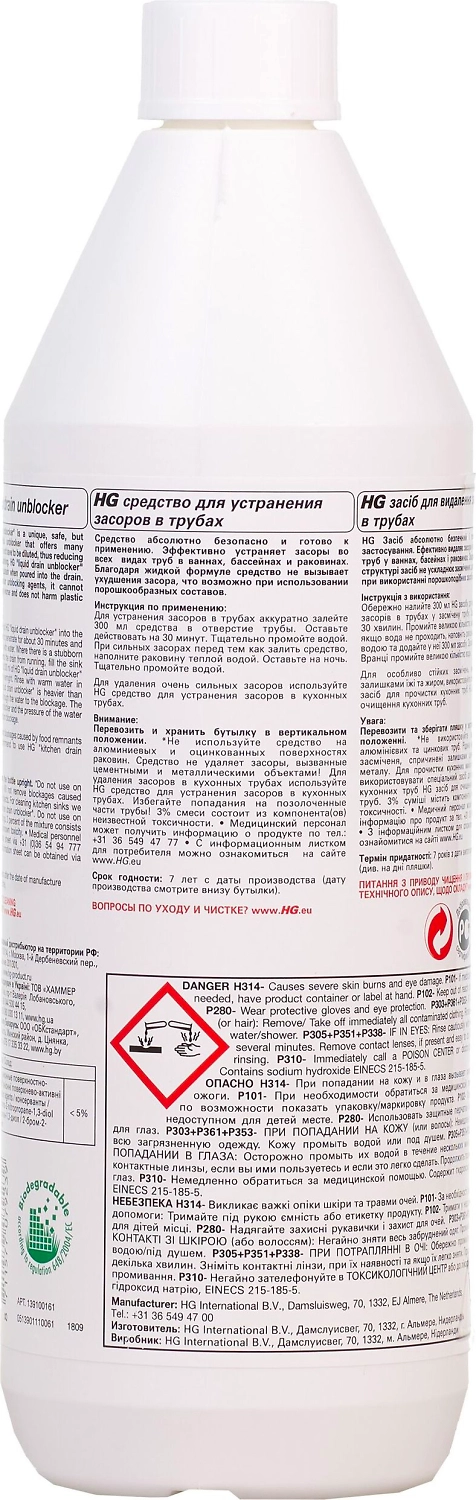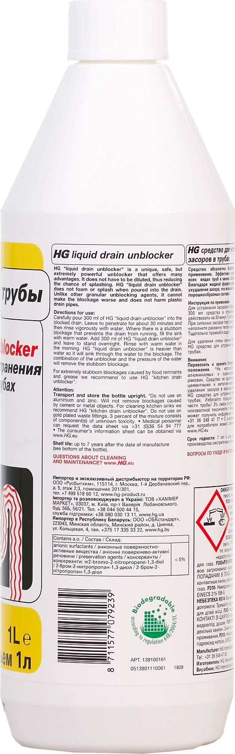 HG средство для устранения засоров в трубах абсолютно безопасно и готово к применению. Эффективно устраняет засоры во всех видах труб в ваннах, бассейнах и раковинах. Данное средство также подходит для прочистки теплочувствительных пластиковых труб. Благодаря жидкой формуле средство не вызывает ухудшения засора, что возможно при использовании порошкообразных составов.