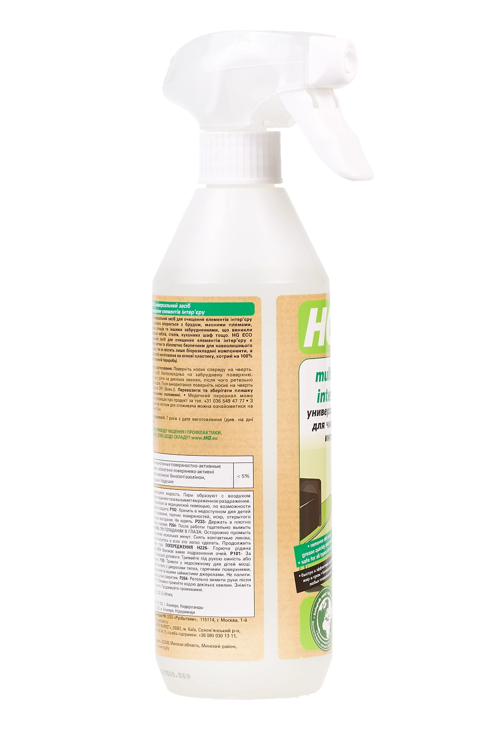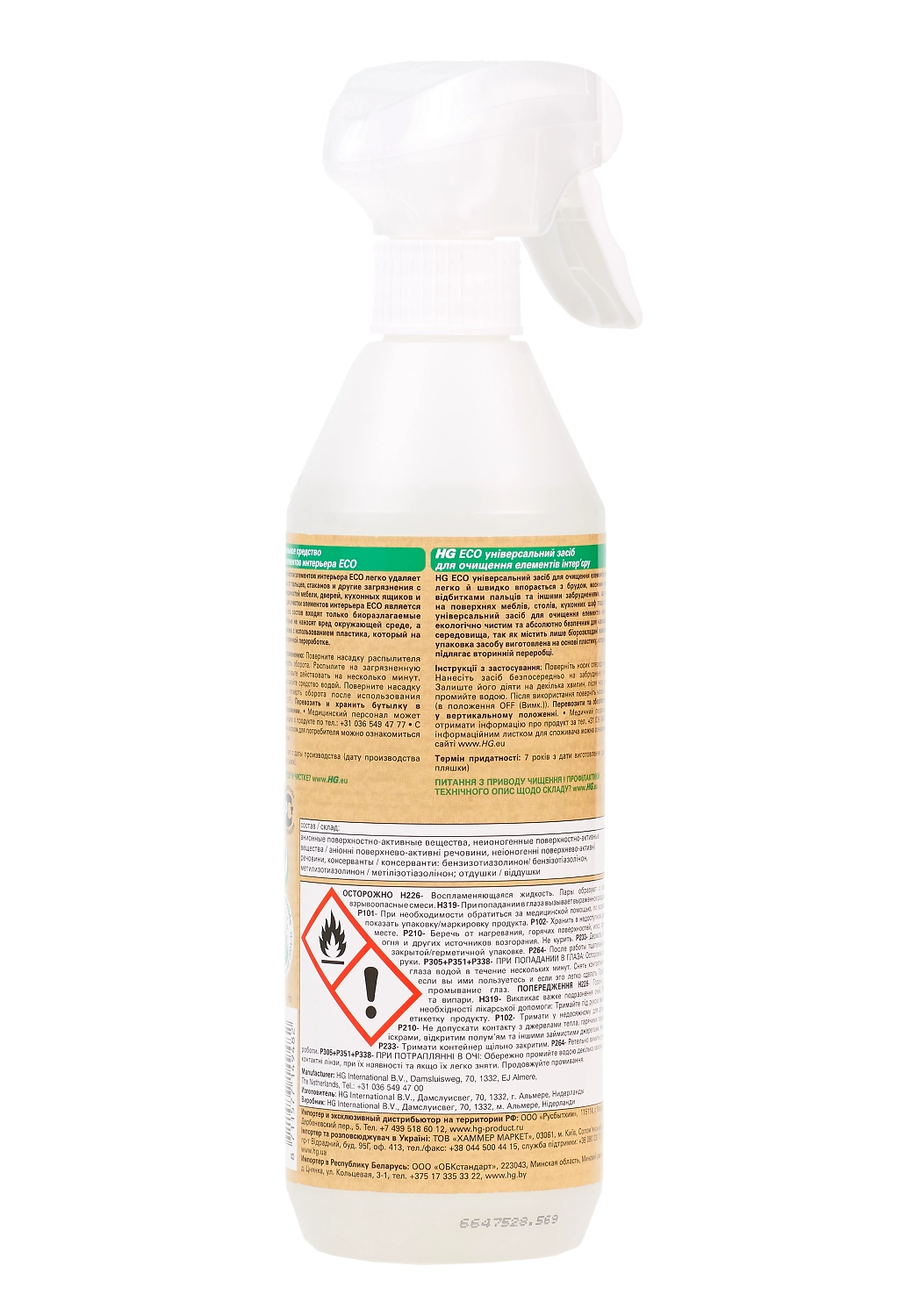 HG средство для очистки элементов интерьера ECO легко удаляет грязь, жир, следы от пальцев, стаканов и другие загрязнения с любых видов поверхностей мебели, дверей, кухонных ящиков и т.д. Средство является экологичным: в его состав входят только биоразлагаемые компоненты, которые не наносят вред окружающей среде, а упаковка изготовлена с использованием пластика, который на 100% подлежит вторичной переработке.