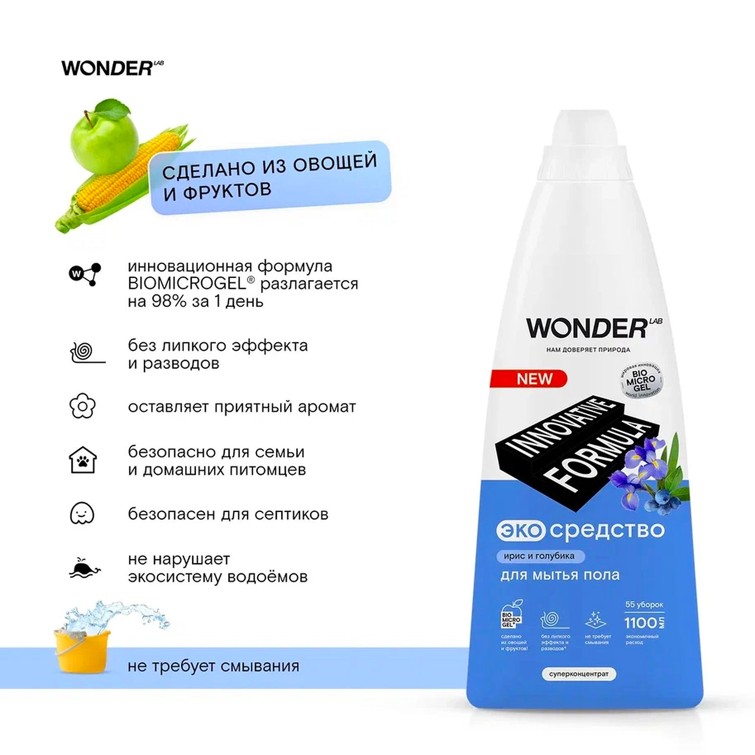 Безопасное и инновационное экосредство для мытья пола WONDER LAB® наполнит дом уютным ароматом ягод и цветов. Эффективно удаляет любые загрязнения с любых напольных покрытий. Быстро высыхает и не оставляет разводов, пленки или “липкого эффекта”.