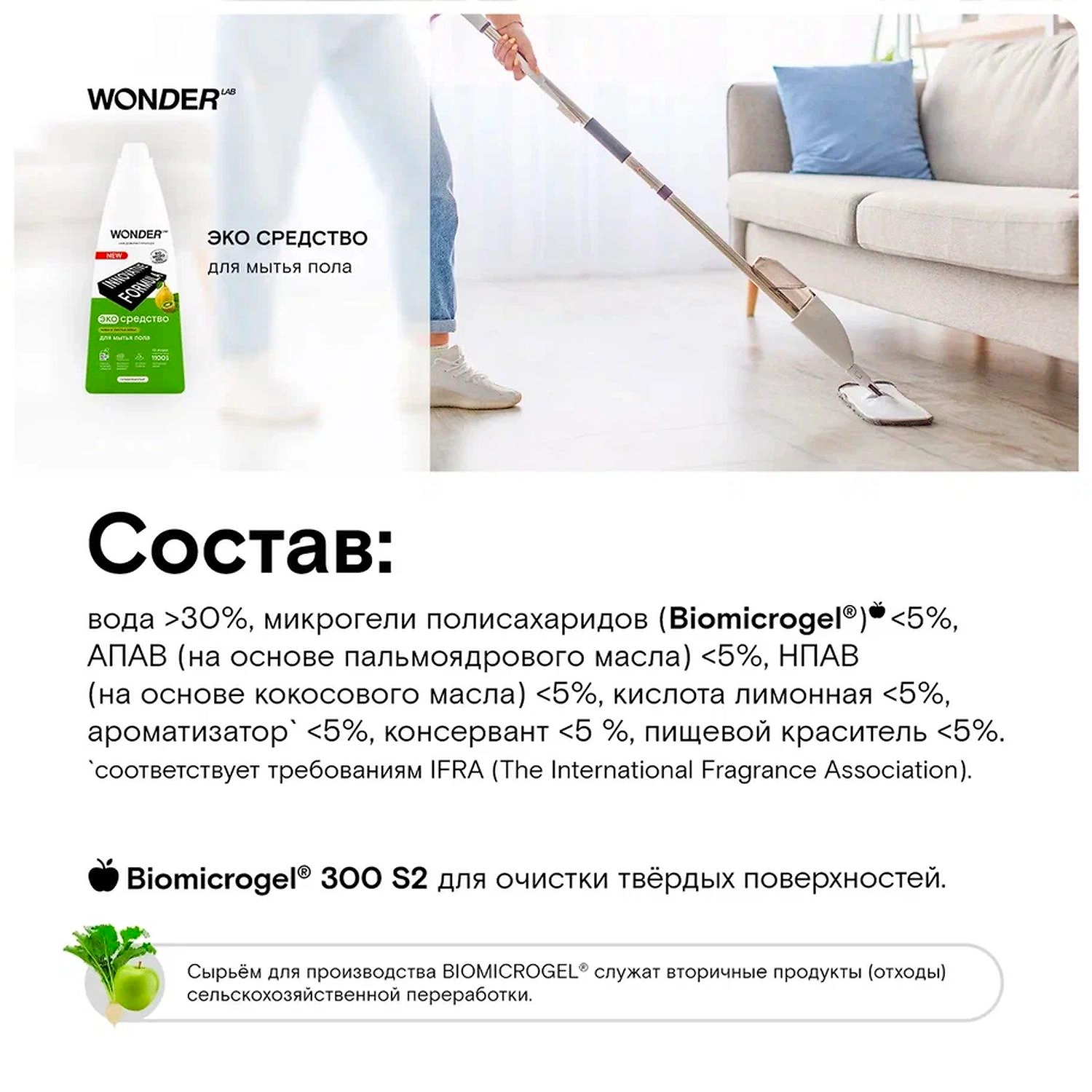 Безопасное и инновационное экосредство для мытья пола WONDER LAB® наполнит дом уютным ароматом зелени и тропических фруктов. Эффективно удаляет любые загрязнения с любых напольных покрытий. Быстро высыхает и не оставляет разводов, пленки или “липкого эффекта”.