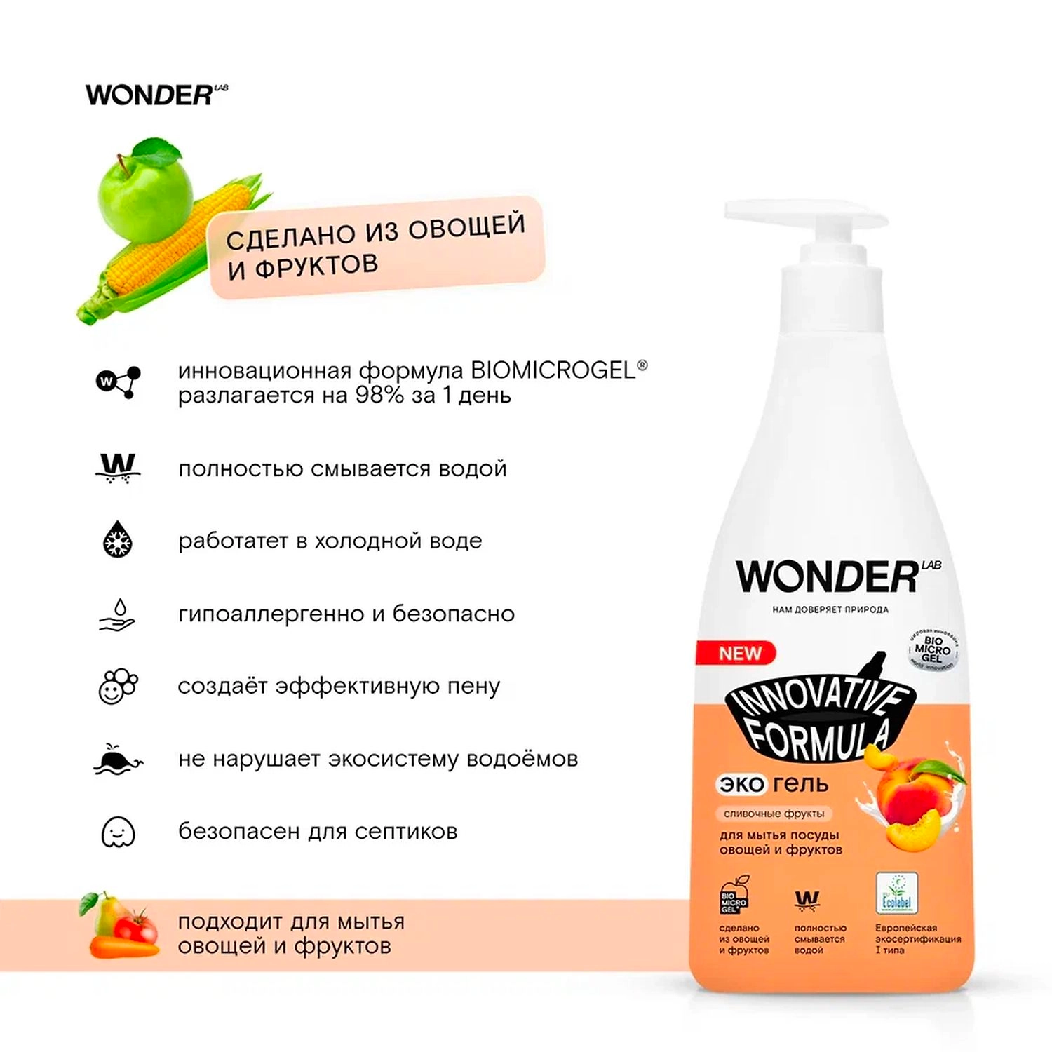 Нанесите небольшое количество геля WONDER LAB на губку или щетку. Помойте посуду как обычно. Ополосните водой. Добавляйте гель по мере необходимости. Подходит для мытья овощей и фруктов.