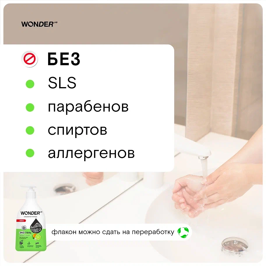 Нанесите небольшое количество геля WONDER LAB, нажав на дозатор, помойте руки как обычно. Гель подходит для умывания. Для этого нанесите небольшое количество геля на руки, вспеньте, нанесите на лицо, смойте водой.
