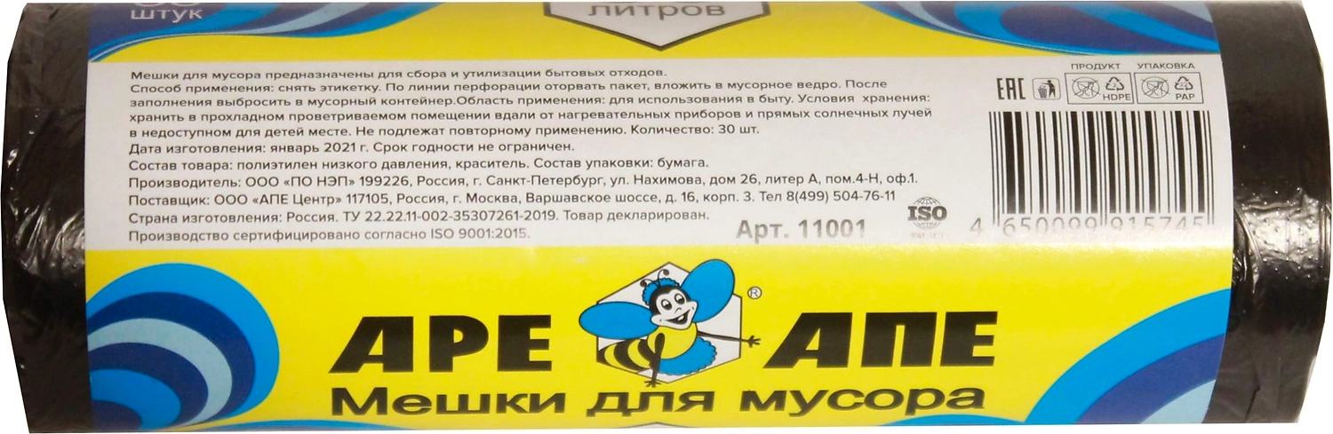 Пакеты для мусора ПНД (полиэтилен низкого давления). В результате получаются изделия с высокой плотностью, прочностью и стойкостью к агрессивным условиям эксплуатации. Применяются в качестве одноразовых мусорных пакетов бытового назначения. Они могут помещаться в мусорные контейнеры, что предупреждает их загрязнение внутри. Это пакеты водонепроницаемые, одноразового использования, которые выбрасываются вместе с отходами. Вид дна в виде звезды. ( Мусорные пакеты, для отходов должны иметь дно звёздочкой. Именно этот вариант выдерживает больший вес). Пакет черного цвета.