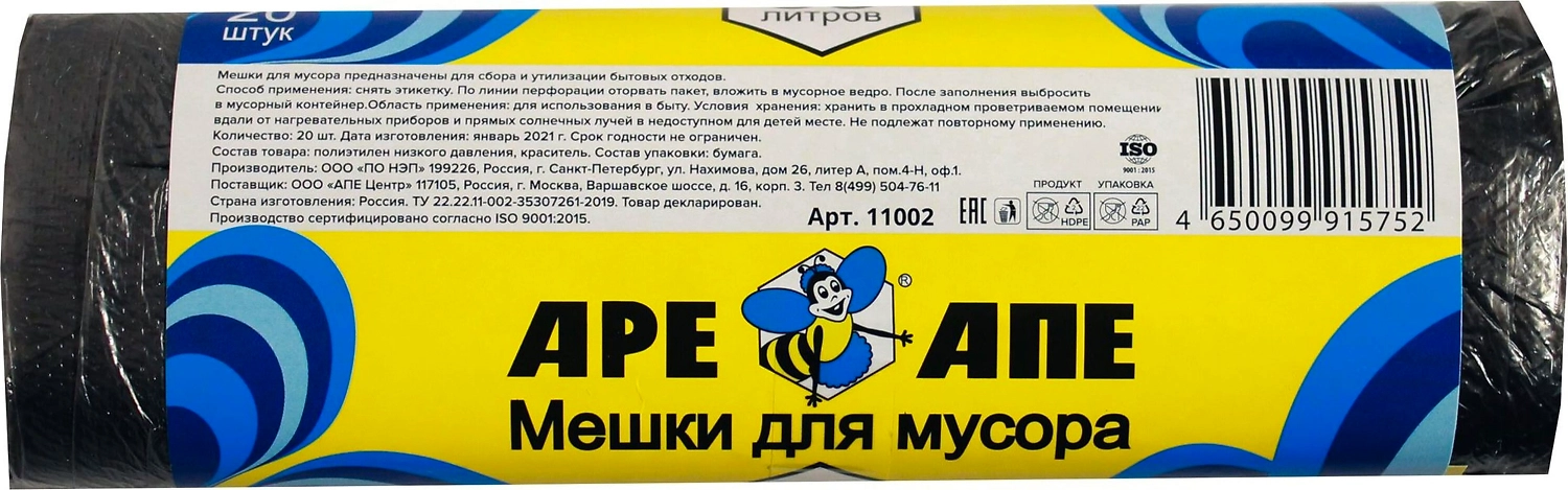 Пакеты для мусора ПНД (полиэтилен низкого давления). В результате получаются изделия с высокой плотностью, прочностью и стойкостью к агрессивным условиям эксплуатации. Применяются в качестве одноразовых мусорных пакетов бытового назначения. Они могут помещаться в мусорные контейнеры, что предупреждает их загрязнение внутри. Это пакеты водонепроницаемые, одноразового использования, которые выбрасываются вместе с отходами. Вид дна в виде звезды ( Мусорные пакеты, для отходов должны иметь дно звёздочкой. Именно этот вариант выдерживает больший вес). Пакет черного цвета.
