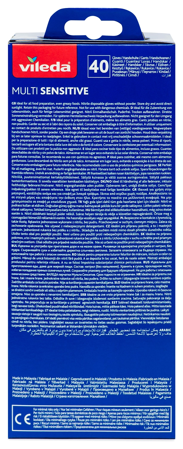Нитриловые перчатки Мульти Сенситив от немецкого бренда Виледа выполнены из 100% нитрила и не вызывают аллергических реакций на протеин латекса.