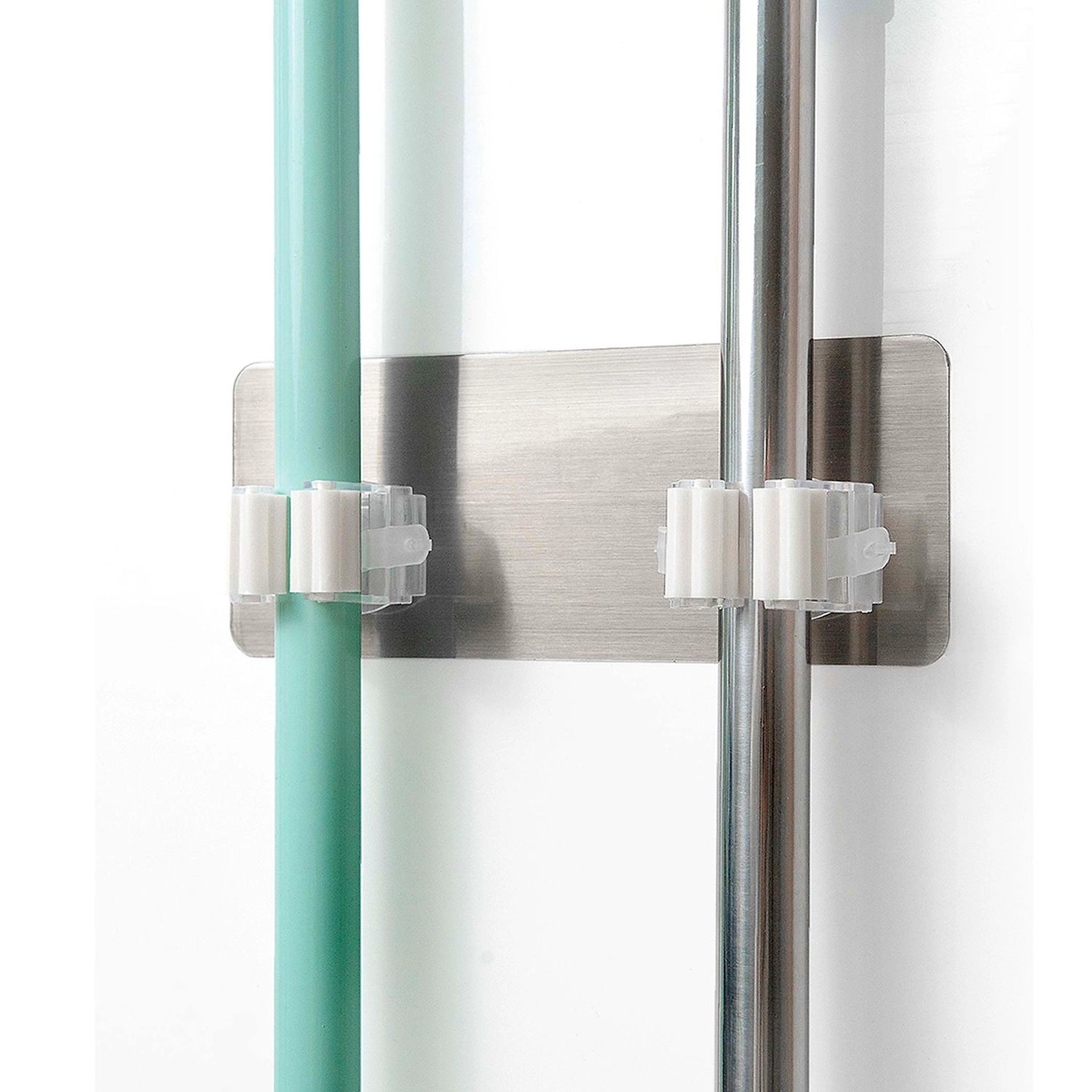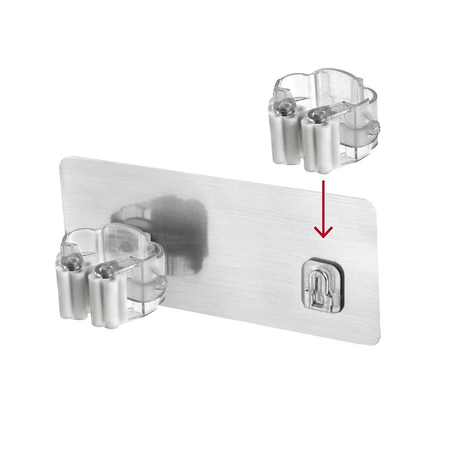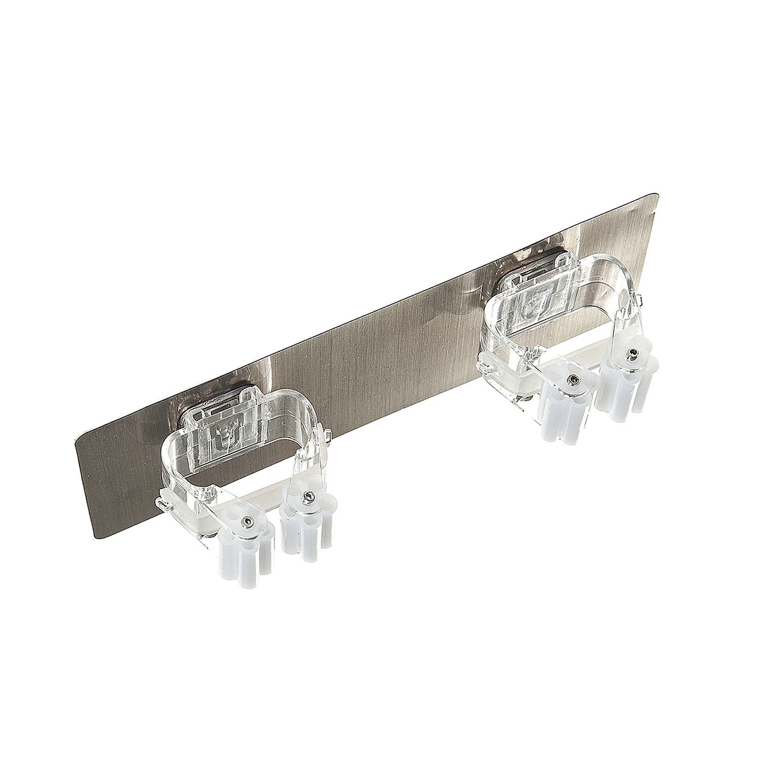 Двойной держатель предназначен для удобного и компактного хранения домашнего уборочного инвентаря; легко и прочно фиксирует инвентарь разного диаметра (до 35 мм); удобно крепить держатель к поверхности на прочный клеевой слой; выдерживают нагрузку до 5 кг; не повреждает поверхность инвентаря; серебристая основа в стиле Hi-Teck.