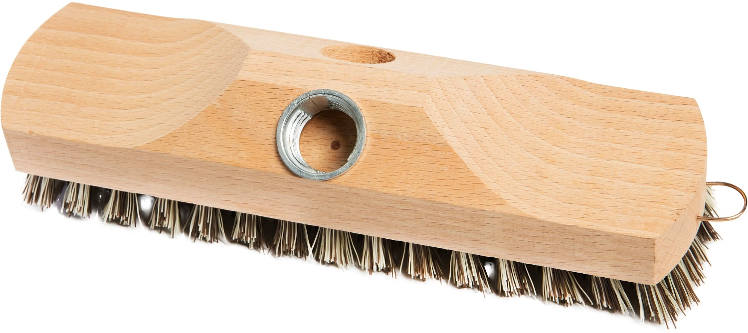 Щетка для пола LUX-TOOLS со смешанной щетиной изготовлена ​​из неокрашенного дерева, предназначена для уборки помещений, имеет отверстие для черенка и металлическую резьбу.