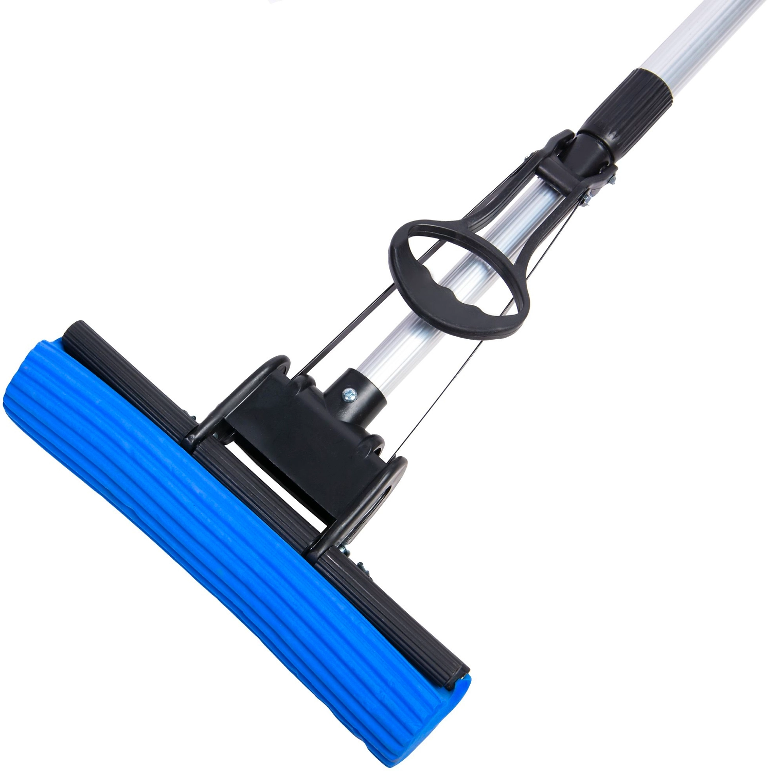 Швабра для уборки полов с губкой на основе поливинилацетата, с отжимным механизмом и телескопической ручкой максимальной длины 115 см.